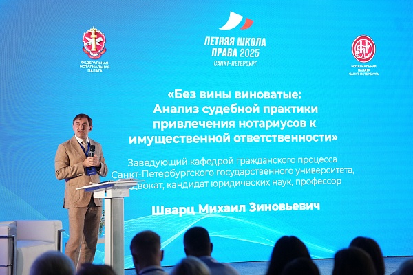 В первый учебный день заведующий кафедрой гражданского процесса Санкт-Петербургского государственного университета, адвокат, кандидат юридических наук, профессор Михаил Шварц провел анализ судебной практики привлечения нотариусов к имущественной ответственности. С 2021 года в обзоре судебной практики Верховного суда Российской Федерации появилась "невиновная" ответственность нотариуса, то есть профессиональный риск. На лекции рассматривались практические и теоретические установления границ материальной ответственности нотариуса в случае отсутствия вины.