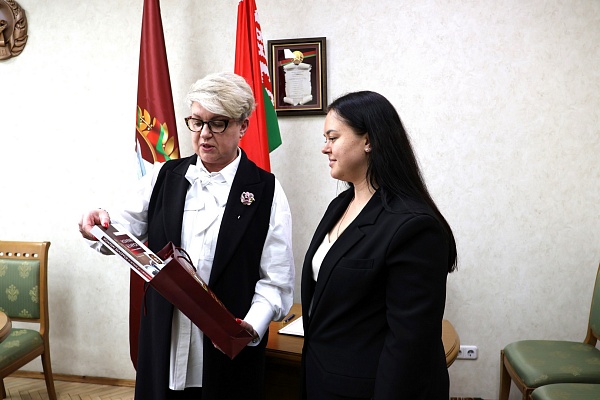 По традиции новому нотариусу вручили памятные сувениры – два подарочных издания: Научно-практический комментарий к Конституции Республики Беларусь и книгу «Нотариат Беларуси: от истоков до современности», а также корпоративный значок.
