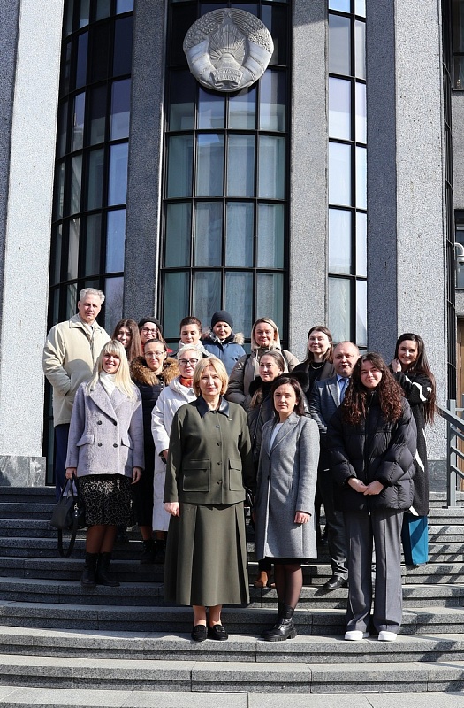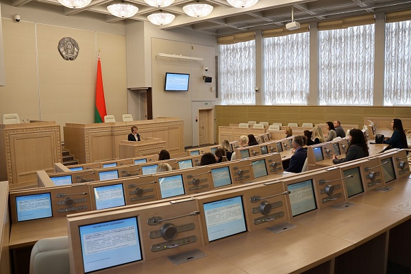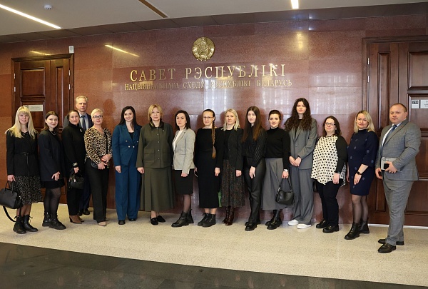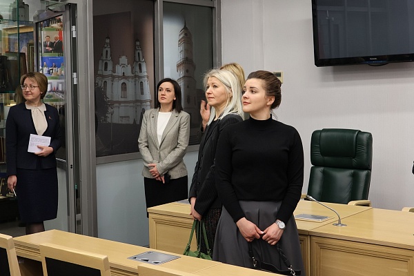 Запоминающимся стало посещение зала заседаний Совета Республики – места, где принимаются важнейшие законодательные акты нашей страны. Начальник отдела по обеспечению деятельности Постоянной комиссии по экономике, бюджету и финансам Татьяна Козлова подробно и очень содержательно рассказала о структуре Совета Республики и его полномочиях, познакомила с работой постоянных комиссий. Татьяна Николаевна также ознакомила представителей БНП с процессом работы сенаторов над законодательными актами, рассказала о взаимодействии с гражданами. К слову, проведение выездных приемов и прямых телефонных линий, рассмотрение письменных и электронных обращений – одна из приоритетных задач, реализуемых членами Совета Республики. За прошлый год сенаторы рассмотрели более шести с половиной тысяч обращений жителей нашей страны и каждому оказали необходимую поддержку.