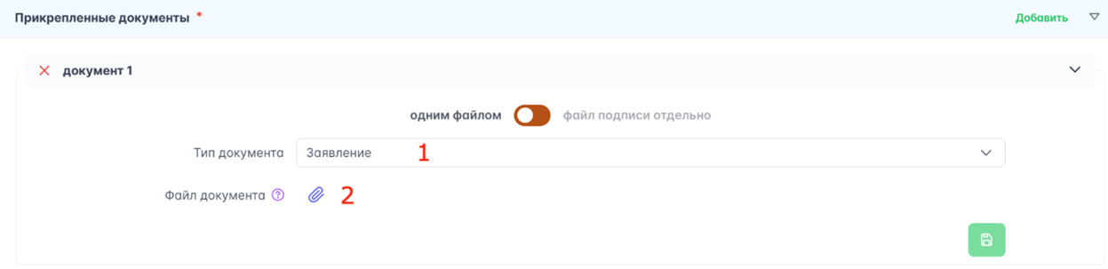 Для прикрепления документов необходимо выбрать «Тип документа» (1) и прикрепить соответствующий документ (2).