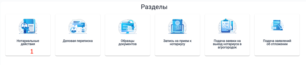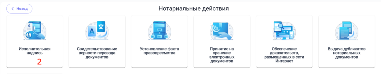 Для этого в ЛК необходимо выбрать раздел «Нотариальные действия» (1), блок «Исполнительная надпись» (2).