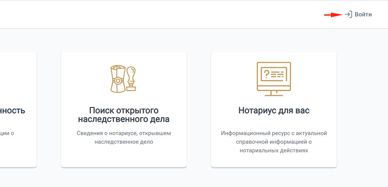Для авторизации и входа в ЛК необходимо перейти на страницу https://enotariat.by и в правом верхнем углу экрана нажать кнопку «Войти».