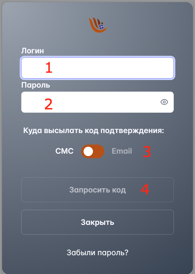 Ввести логин (1), пароль (2), выбрать способ получения кода подтверждения (3), нажать кнопку «Запросить код» (4). Код подтверждения направляется на указанные в заявлении о создании ЛК номер мобильного телефона (посредством SMS) или адрес электронной почты (e-mail).