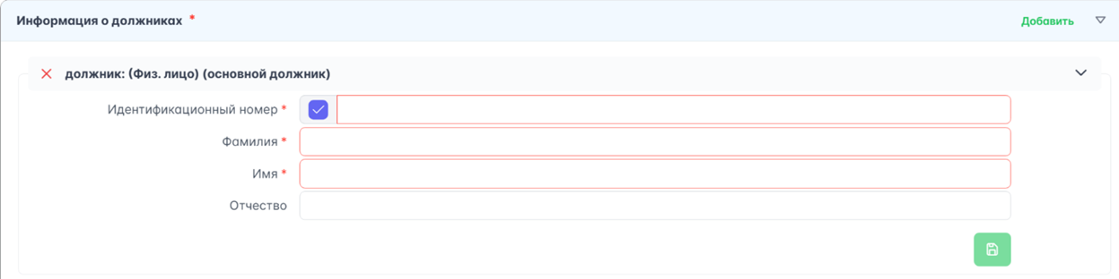 - о должнике, солидарных должниках (при наличии) (обязательные поля для заполнения помечены «*»);