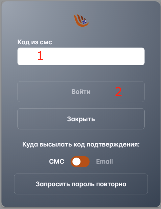 Полученный код подтверждения необходимо ввести в поле «Код из email» или «Код из смс» (1) и нажать кнопку «Войти» (2).