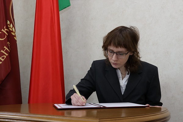 В волнительный для молодых нотариусов день напутственные слова сказала председатель БНП Елена Гринкевич, пожелав коллегам удачи и упорства, а также успешной работы в новом ответственном статусе. Елена Вячеславовна также уверила молодых коллег, что в нотариате впервые приступающие к осуществлению деятельности никогда не остаются один на один со своими вопросами, рядом всегда есть старшие и опытные товарищи, готовые подсказать верное решение в сложной ситуации.