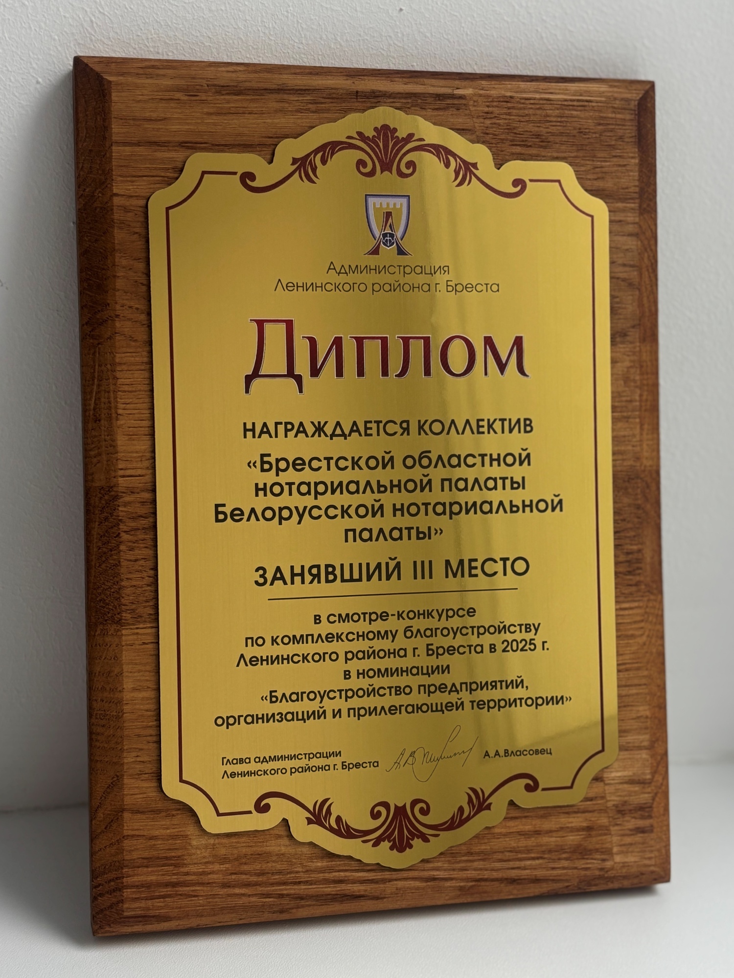 Брестская областная нотариальная палата выражает благодарность администрации Ленинского района города Бреста за высокую оценку и обещает и в дальнейшем прилагать все усилия для благоустройства и процветания родного города.