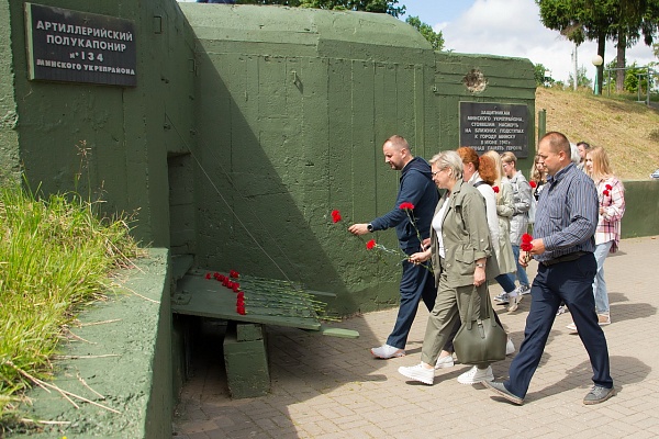 Началось посещение комплекса с церемонии возложения цветов. В память о подвиге защитников Родины, представители нотариата Гродненщины, во главе с председателем Гродненской областной нотариальной палаты Людмилой Орсик, оставили цветы у артиллерийских полукапониров.