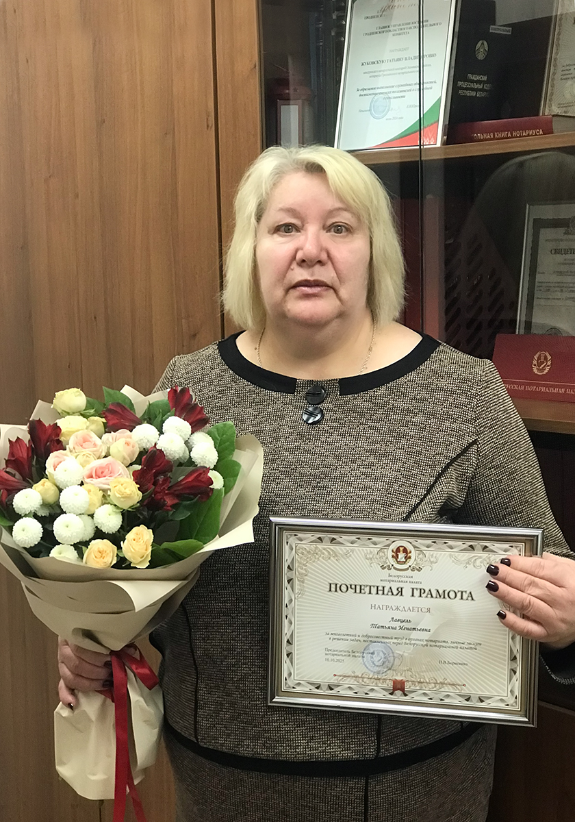 Сегодня заслуженная награда Белорусской нотариальной палаты была вручена нотариусу Гродненского нотариального округа Татьяне Лавцель, человеку, который посвятил нотариату более 20 лет своей жизни.За многолетний и добросовестный труд в органах нотариата, личные заслуги в решении задач, поставленных перед Белорусской нотариальной палатой, Татьяна Игнатьевна удостоилась Почетной грамоты Белорусской нотариальной палаты.