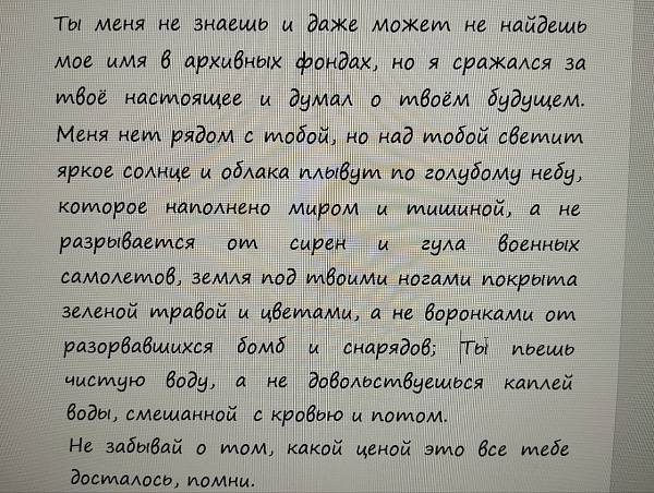 Ты меня не знаешь и даже может не найдешь мое имя в архивных фондах, но я сражался за твоё настоящее и думал о твоём будущем. Меня нет рядом с тобой, но над тобой светит яркое солнце и облака плывут по голубому небу, которое наполнено миром и тишиной, а не разрывается от сирен и гула военных самолетов, земля под твоими ногами покрыта зеленой травой и цветами, а не воронками от разорвавшихся бомб и снарядов; Ты пьешь чистую воду, а не довольствуешься каплей воды, смешанной с кровью и потом.
