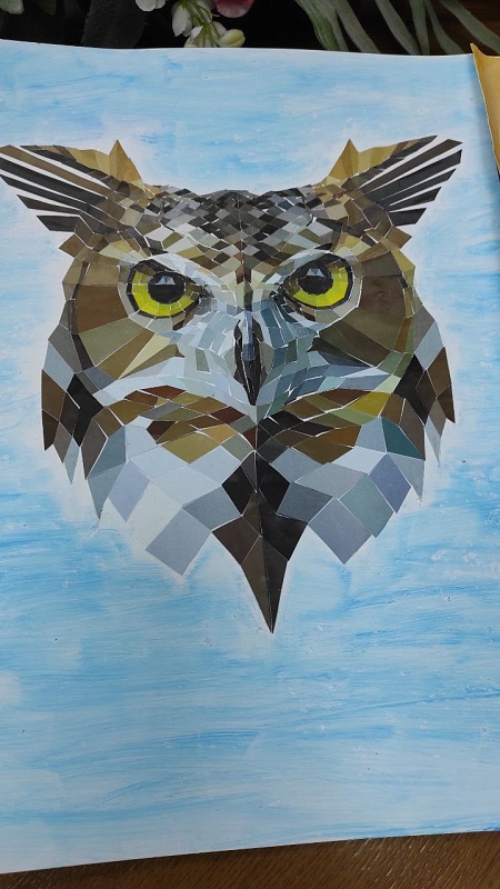 2 место — Саша Царенко (14 лет) и ювелирно выложенная аппликация "Сова нотариата".