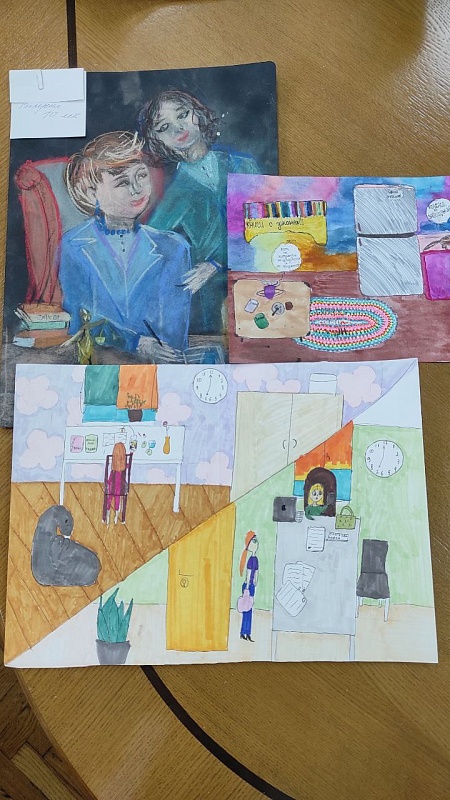 И дольше всего зависаешь у картин, где проработаны мелкие детали. Это третий критерий. Такие рисунки интересно рассматривать. Здесь и юмор, и атмосфера, и детские чувства: гордость за мамину профессию, тоска, пока мама на работе, непосредственность и очарование «моя мама лучше всех».