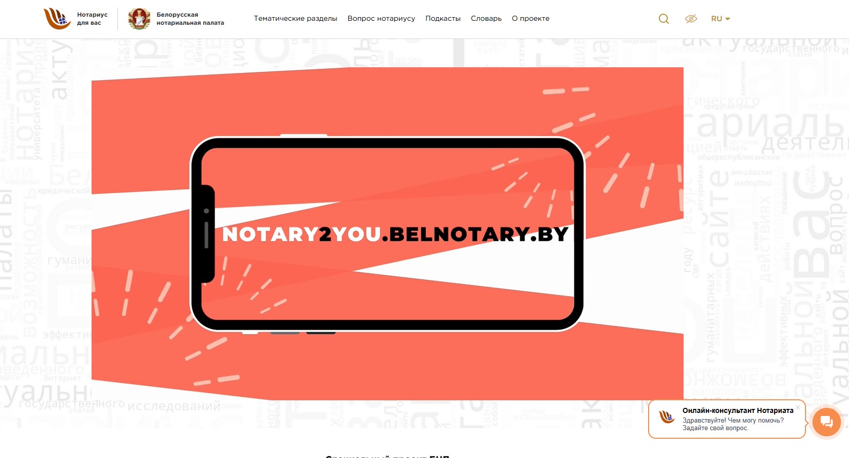 Нотариат Беларуси и ранее развивал правовое просвещение в сети Интернет, однако полученные сведения вдохновили на активизацию работы в данном направлении. С целью удовлетворения запросов граждан на получение качественной и доступной правовой информации о нотариате в Интернете, в марте 2024 года Белорусской нотариальной палатой был введен в эксплуатацию информационно-просветительский ресурс «Нотариус для вас». На сайте в доступной форме изложена информация о каждом из нотариальных действий, приведены алгоритмы действий в различных ситуациях, в которых может помочь нотариус. Для удобства пользователей информация разделена на тематические подборки: «Нотариус детям», «Нотариус бизнесу», «Нотариус пожилым людям» и др. В любое удобное время посетители сайта могут получить доступ к подкасту – аудио и видеофайлы, посвященные нотариальным действиям, другому контенту. Например, словарю нотариальных терминов. На сайте также имеется возможность задать вопрос и получить ответ нотариуса.