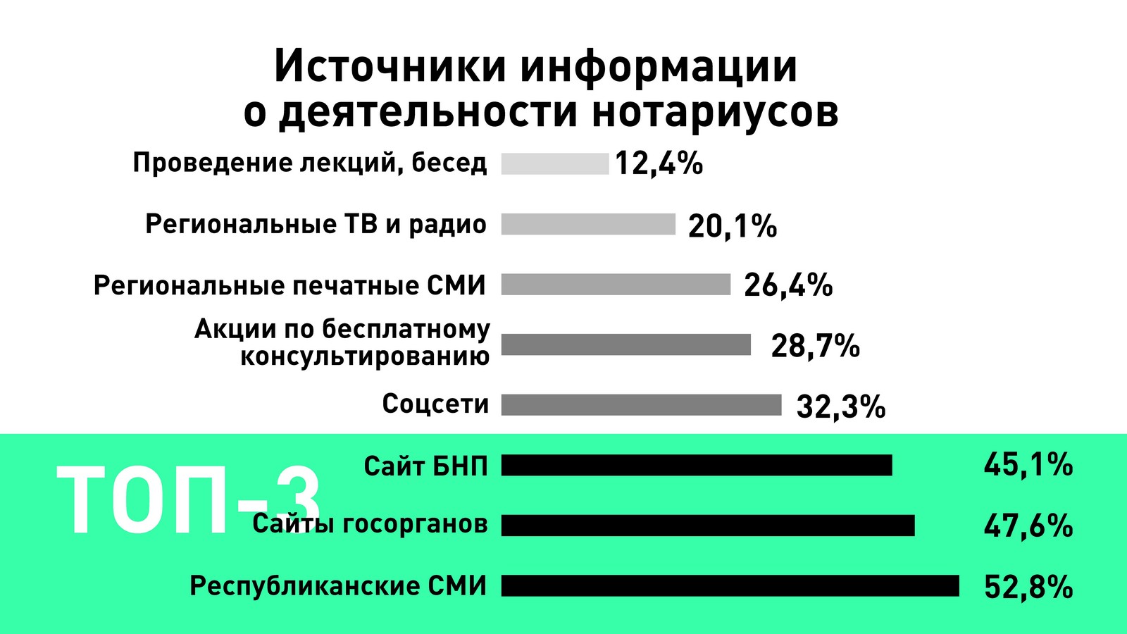 Планирование деятельности нотариата Беларуси в 2024 году в части правового просвещения по ряду направлений базировалось на проведенном по заказу БНП Центром социально-гуманитарных исследований БГЭУ в 2023 году исследования общественного мнения, которое, в том числе, включало определение уровня информированности белорусов о нотариате и услугах нотариуса. Участниками опроса стали посетители нотариальных контор и нотариальных бюро. Одним из наиболее эффективных источников для просвещения населения участниками исследования назван сайт Белорусской нотариальной палаты.