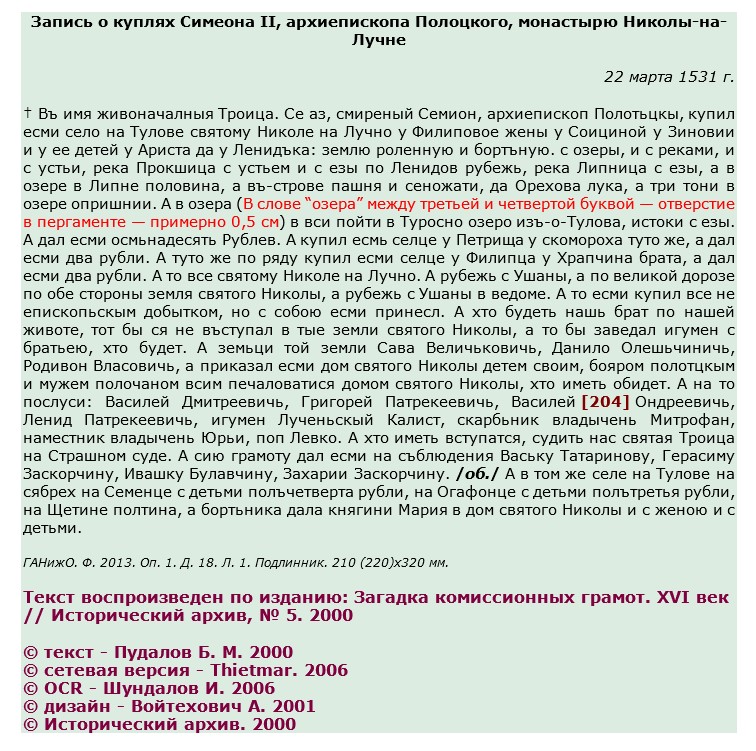 Текст воспроизведен по изданию: “Сим листом моим записую вечно и навеки непорушно”: Поступная грамота Григория Игинбутовича Юрию Радзивиллу. 1539 г. // Исторический архив, № 6. 1999